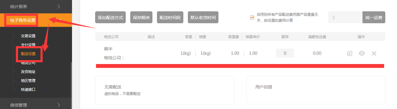 2.由于需要使用货到付款,需要开配送设置中开启一种物流配送方式。