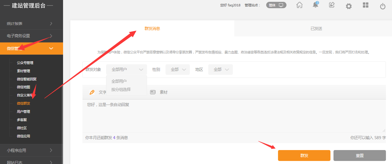 操作方法:登录微信管理=》微信群发=》根据需要填写文字/图片/内容后,选择对群发对象发送即可。
