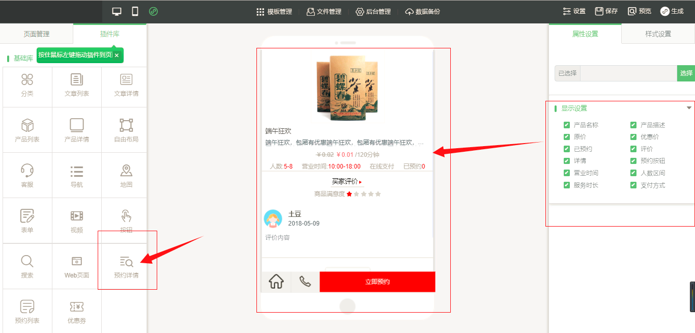 9.在编辑器中,拖入一个“预约详情”的页面,里面的内容为预约的详情信息,在“属性设置”中同样有“显示设置”;在“样式设置”中可以进行文字以及按钮等设置项的设置,如图所示: